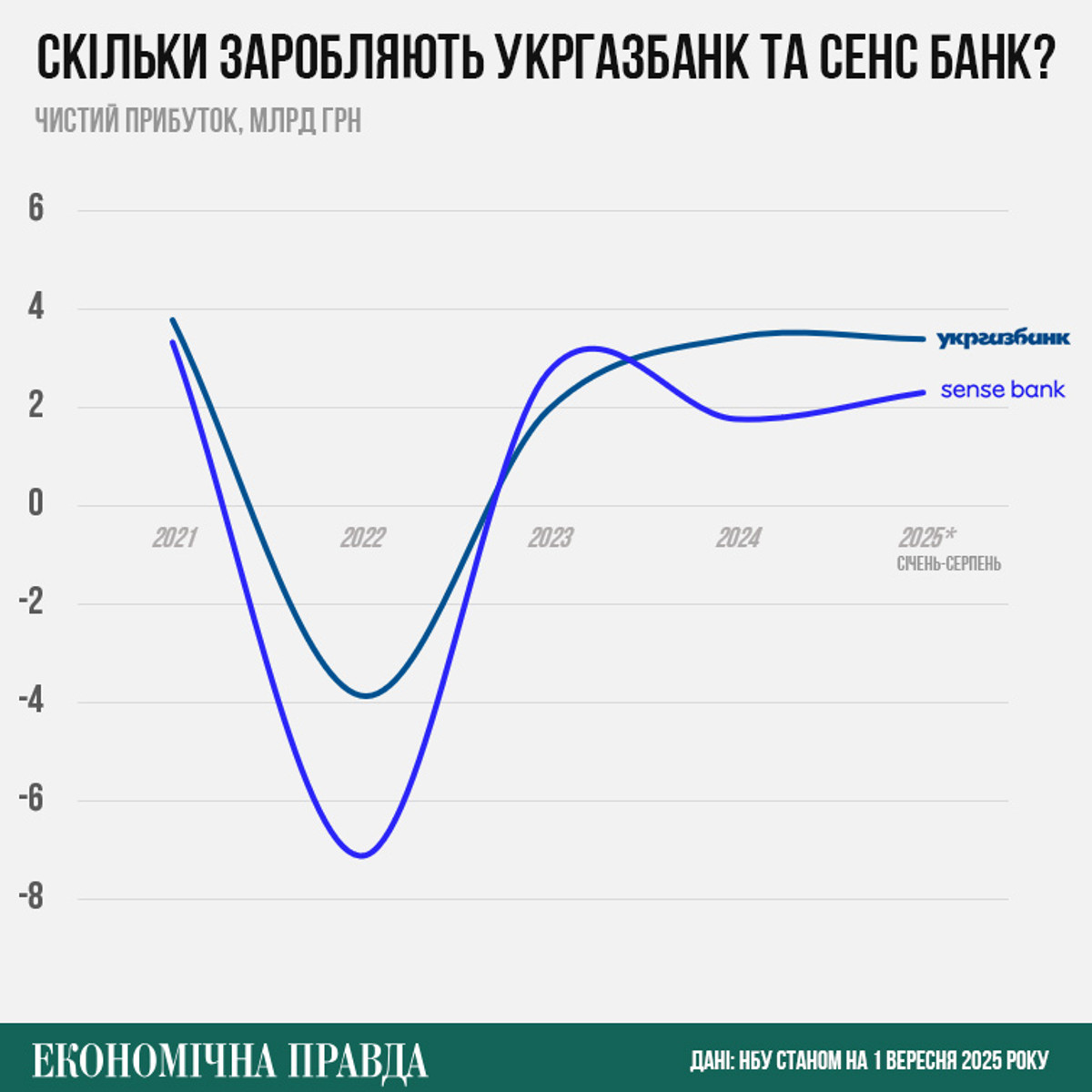 Для Укргазбанку 2025-й може стати рекордним за прибутком: за січень-серпень він заробив 3,38 млрд грн, повернувшись за цим показником на довоєнний рівень. "Сенс банк" за цей час отримав 2,3 млрд грн чистого прибутку, проте з початку великої війни чистий фінансовий результат установи – мінус 345 млн грн.