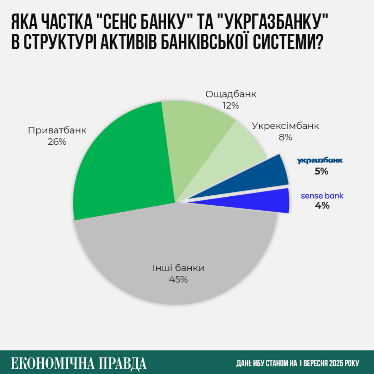 "Сенс банк" та Укргазбанк входять до переліку системно важливих (на них припадають 9% усіх активів). За даними НБУ, чверть активів Укргазбанку – це ОВДП, кредити юридичним особам – 35,2% (68,2 млрд грн – без урахування резервів), фізичним особам – 4,8% (9,4 млрд грн). Кредитний портфель громадян у "Сенс банку" на третину більший (12,45 млрд грн) і становить 8% активів установи. Ще 23,6% активів – це заборгованість компаній, 18,7% – ОВДП.