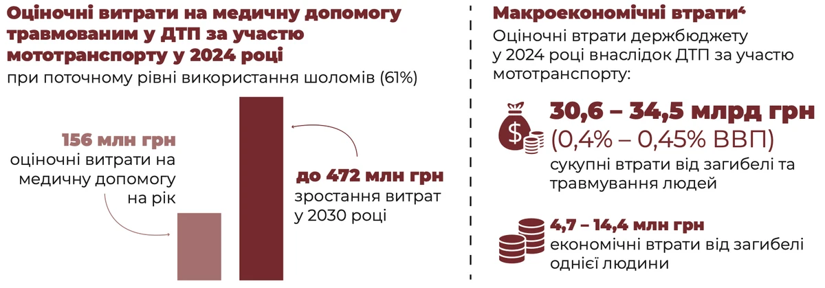У 2024 році оціночні бюджетні витрати на медичну допомогу травмованим водіям та пасажирам мототранспорту сягнули 156 млн грн. Якщо ситуація не зміниться, то до 2030 року ця сума може зрости утричі – до 472 млн грн.