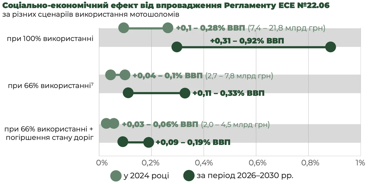 У довгостроковій перспективі (2026-2030 роки) ефект стає ще відчутнішим: 0,31-0,92% ВВП – при стовідсотковому використанні сертифікованих шоломів, 0,11-0,33% ВВП – при 66-відсотковому охопленні.