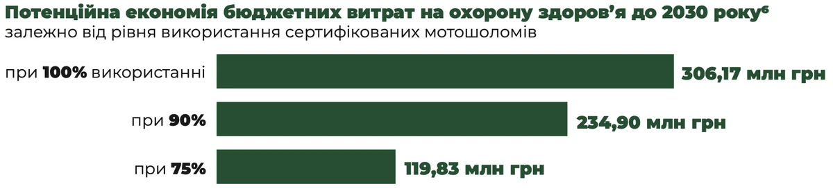 Результати показали: впровадження регламенту може зменшити бюджетні витрати на охорону здоров'я вже в перші роки. Залежно від рівня використання сертифікованих шоломів потенційна економія становитиме: 306,2 млн грн – за умови стовідсоткового використання, 234,9 млн грн – за високого рівня охоплення (90%), 119,8 млн грн – за помірного рівня охоплення (75%).