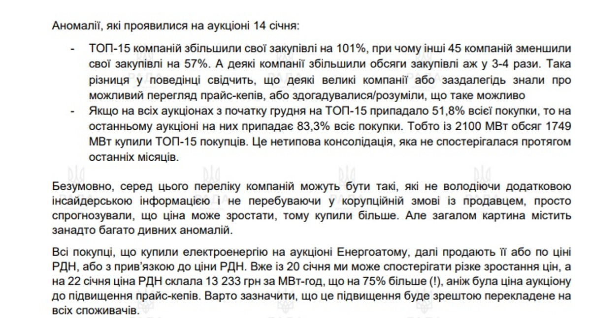 За два дні до цього, 14 січня, "Енергоатом" провів аукціон і продав 2100 МВт базового навантаження на період 21–31 січня за середньою ціною 7565 грн за МВт-год. Це сталося за кілька днів до початку періоду поставки і до офіційного рішення про підвищення прайс-кепів.