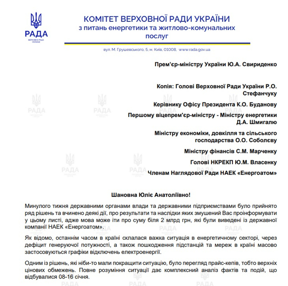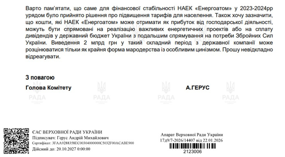 Про це йдеться у зверненні голови парламентського комітету з питань енергетики та ЖКП Андрія Геруса до прем'єр-міністерки Юлії Свириденко, спікера Верховної Ради Руслана Стефанчука та інших керівників органів держуправління. Звернення є в розпорядженні ЕП.