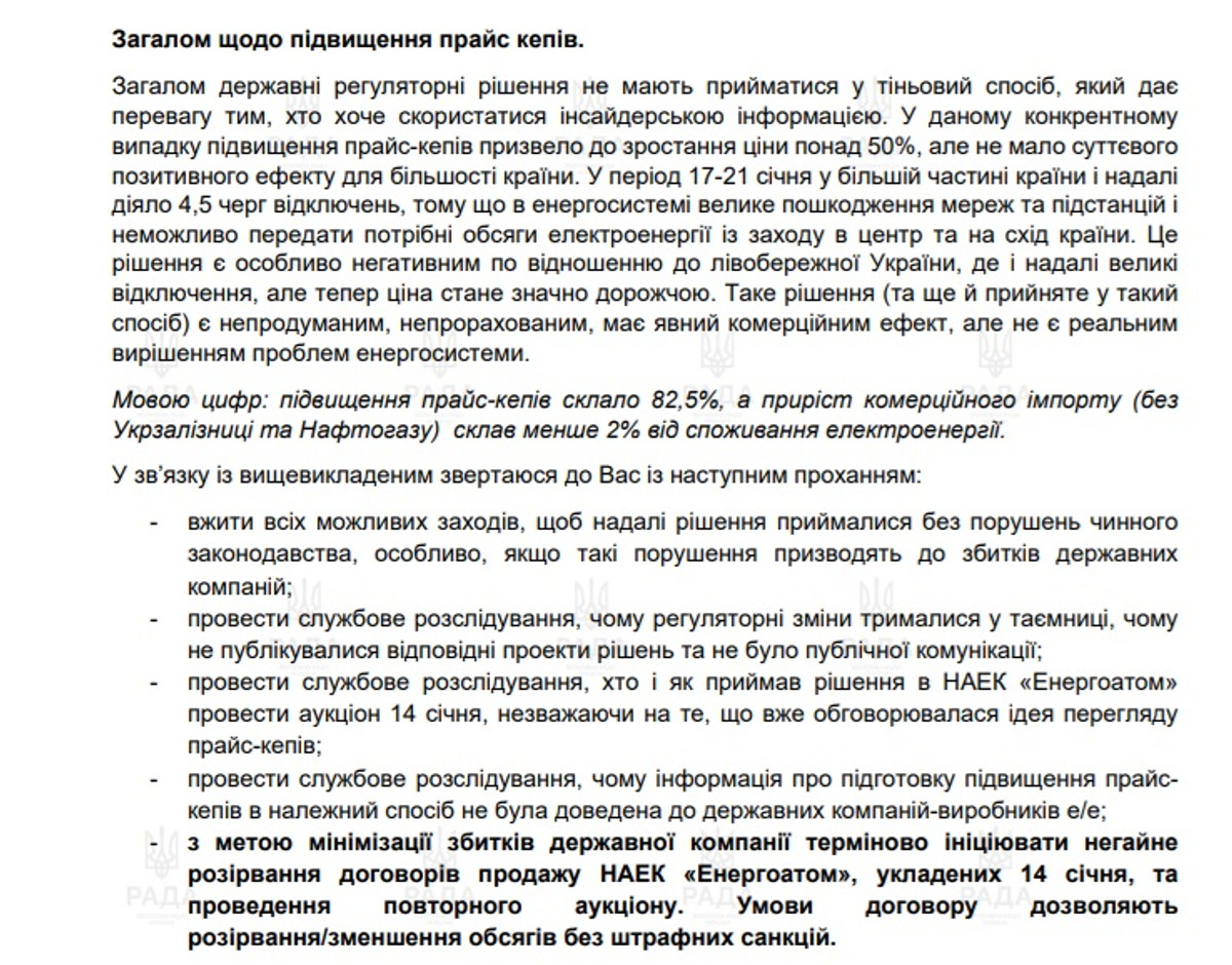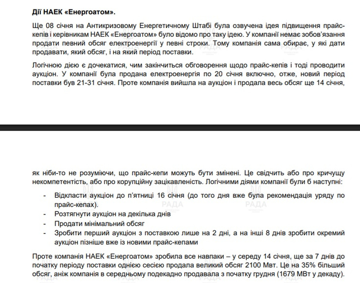 У листі зазначається, що керівництву компанії було відомо про обговорення можливого перегляду граничних цін, однак "Енергоатом" не скористався жодним із логічних сценаріїв мінімізації ризиків – не відклав аукціон, не зменшив обсяг продажу та не розбив його на кілька сесій.