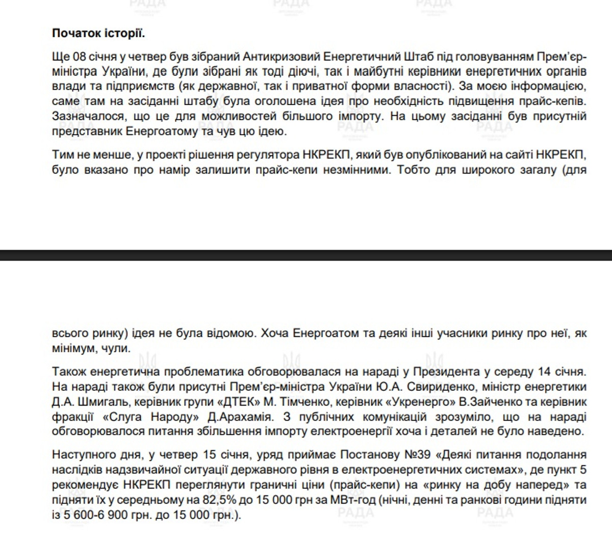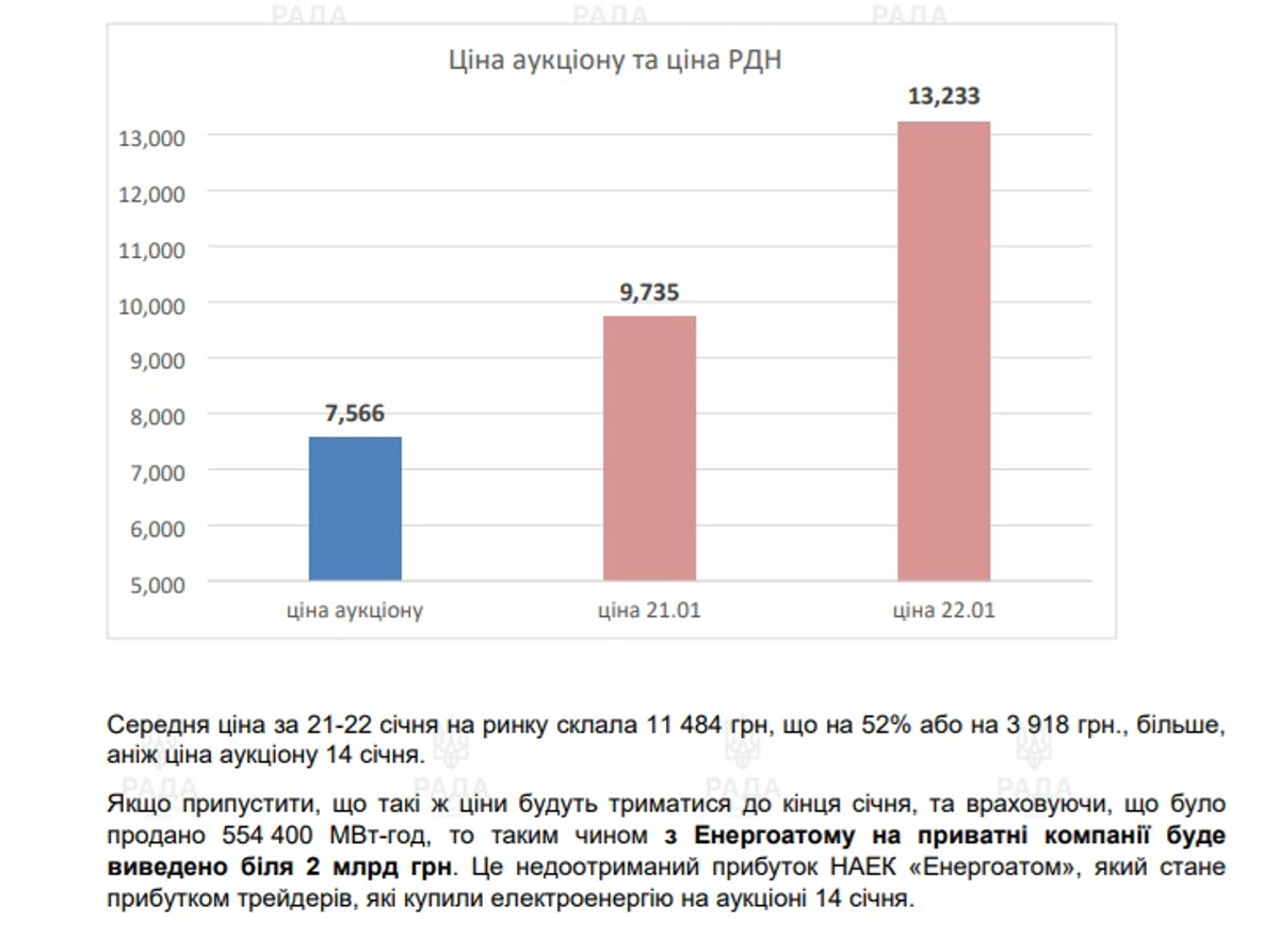 "Але загалом картина містить занадто багато дивних аномалій. Всі покупці, що купили електроенергію на аукціоні "Енергоатому", далі продають її або по ціні РДН (ринок на добу наперед - ред.), або з прив'язкою до ціни РДН. Вже із 20 січня ми може спостерігати різке зростання цін, а на 22 січня ціна РДН склала 13 233 грн за МВт-год, що на 75% більше, аніж була ціна аукціону до підвищення прайс-кепів. Варто зазначити, що це підвищення буде зрештою перекладене на всіх споживачів", - йдеться у зверненні депутата.