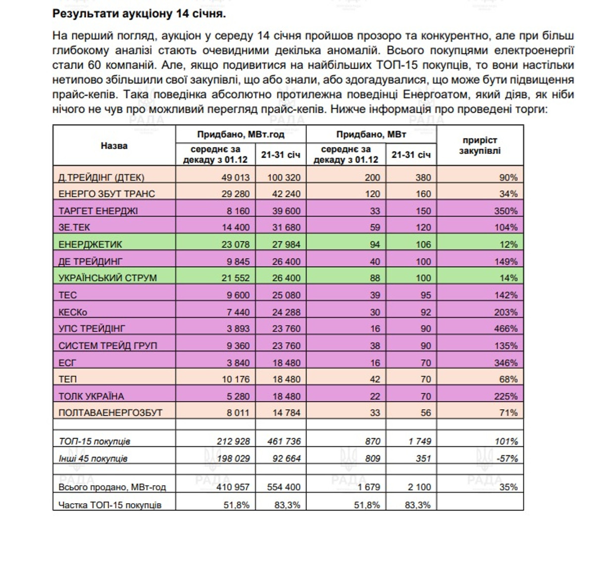 "Якщо на всіх аукціонах з початку грудня на топ-15 припадало 51,8% всієї покупки, то на останньому аукціоні на них припадає 83,3% всіє покупки. Тобто із 2100 МВт обсяг 1749 МВт купили топ-15 покупців. Це нетипова консолідація, яка не спостерігалася протягом останніх місяців", - зазначив Герус.