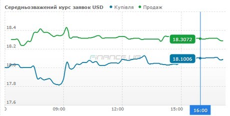 Станом на 16:00, відповідно до заявок фізосіб, середньозважений курс купівлі долара становив 18,1006 гривні, продажу - 18,3072 гривні.