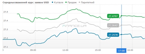 Станом на 17:00, відповідно до заявок фізосіб, середньозважений курс купівлі долара становив 27,2578 гривні, продажу - 27,4707 гривні.