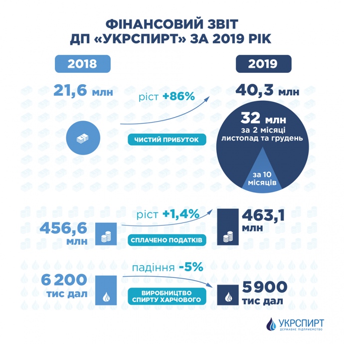 Чистий прибуток "Укрспирту" у 2019-му році склав 40, 3 мільйона гривень, з них більшу частину — 32 мільйона гривень — підприємство отримало за останні два місяці року — листопад та грудень.