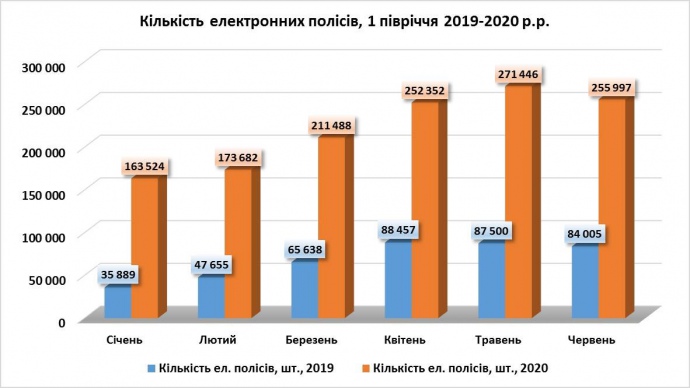 Кількість електронних договорів ОСЦПВ (обов'язкового страхування цивільно-правової відповідальності власників наземних транспортних засобів) у першому півріччі 2020 року становила понад 1,3 млрд грн - це на 224% більше, ніж за аналогічний період минулого року.