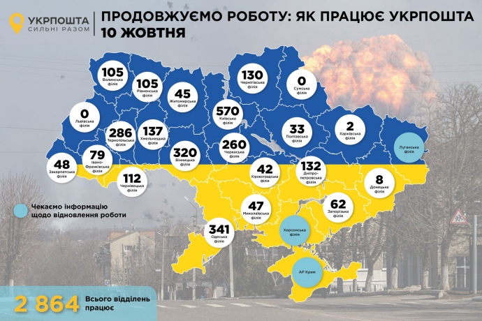 Відповідно до інфографіки, опублікованої Укрпоштою, наразі працюють 2 864 відділення, зокрема, у Київській філії - 570, Одеській - 341.