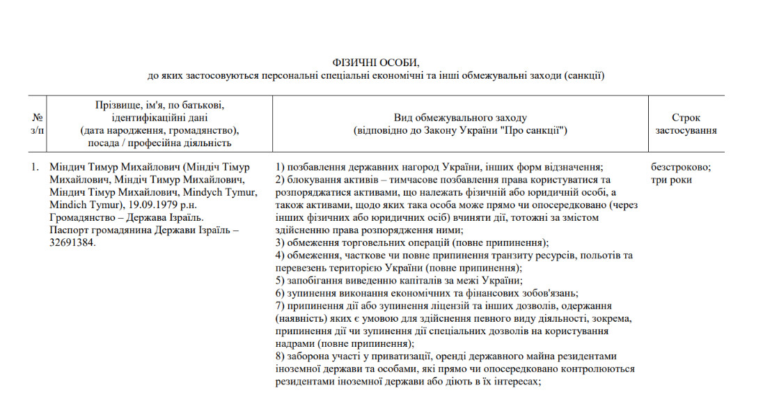 Така практика вже застосовувалась до інших осіб, які мали інше громадянство, зокрема до Ігоря Коломойського. Втім, на відміну від останнього, санкції проти Міндіча не містять українських ідентифікаційних даних.