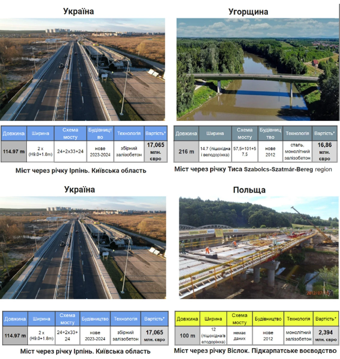 Для порівняння в Угорщині міст через річку Тиса (біля Ніредьхази) довжиною 200 м збудували за приблизно такі ж гроші. А в Польщі міст довжиною 100 м через Віслок в Подкарпатському воєводстві вартував втричі дешевше за український аналог.