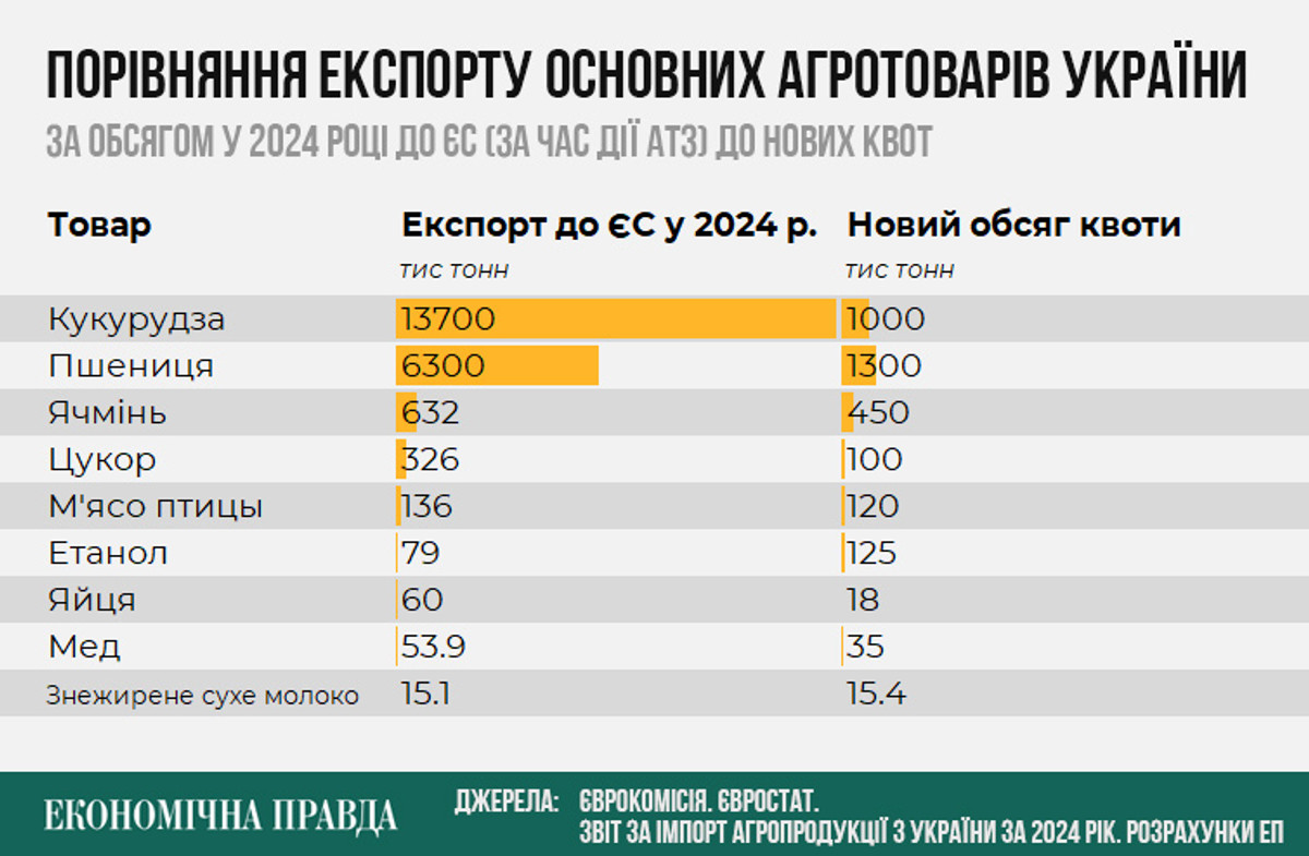 Наприклад, найбільша позиція за обсягами постачання в ЄС – кукурудза. У 2021 році її експорт становив 7,4 млн тонн, у 2024 році – 13,7 млн тонн, а нова квота становить 1 млн тонн – у 13 разів менше, ніж у 2024 році.