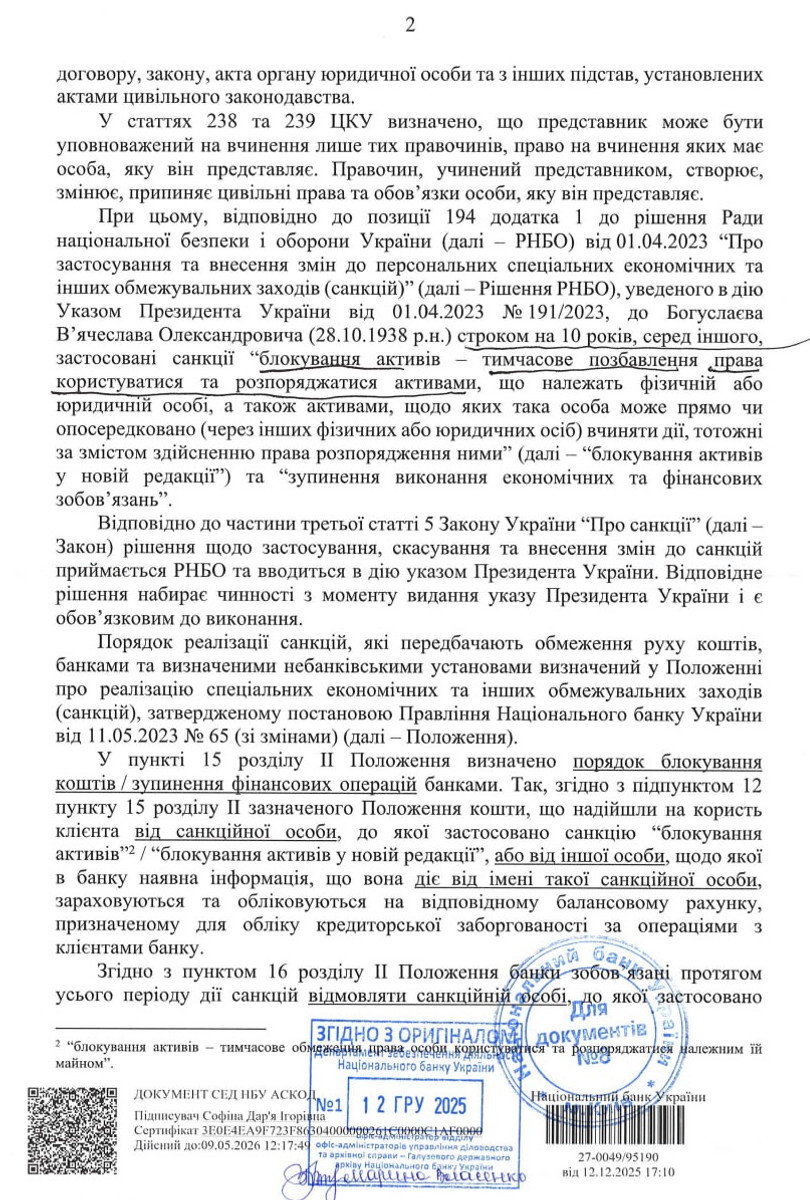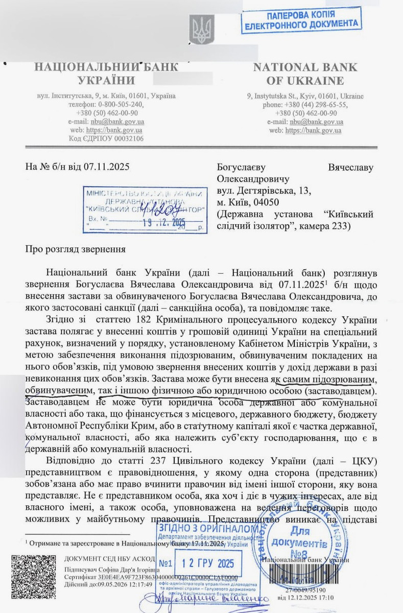 У відповідь на звернення щодо внесення застави за обвинуваченого НБУ зазначив, що третя особа може сплатити кошти за підсанкційну особу за трьох умов: кошти не є коштами санкційної особи, до якої застосована санкція "блокування активів"; кошти сплачуються не від імені такої санкційної особи; сплата застави не призведе до виконання економічних та фінансових зобов'язань на користь санкційної особи.