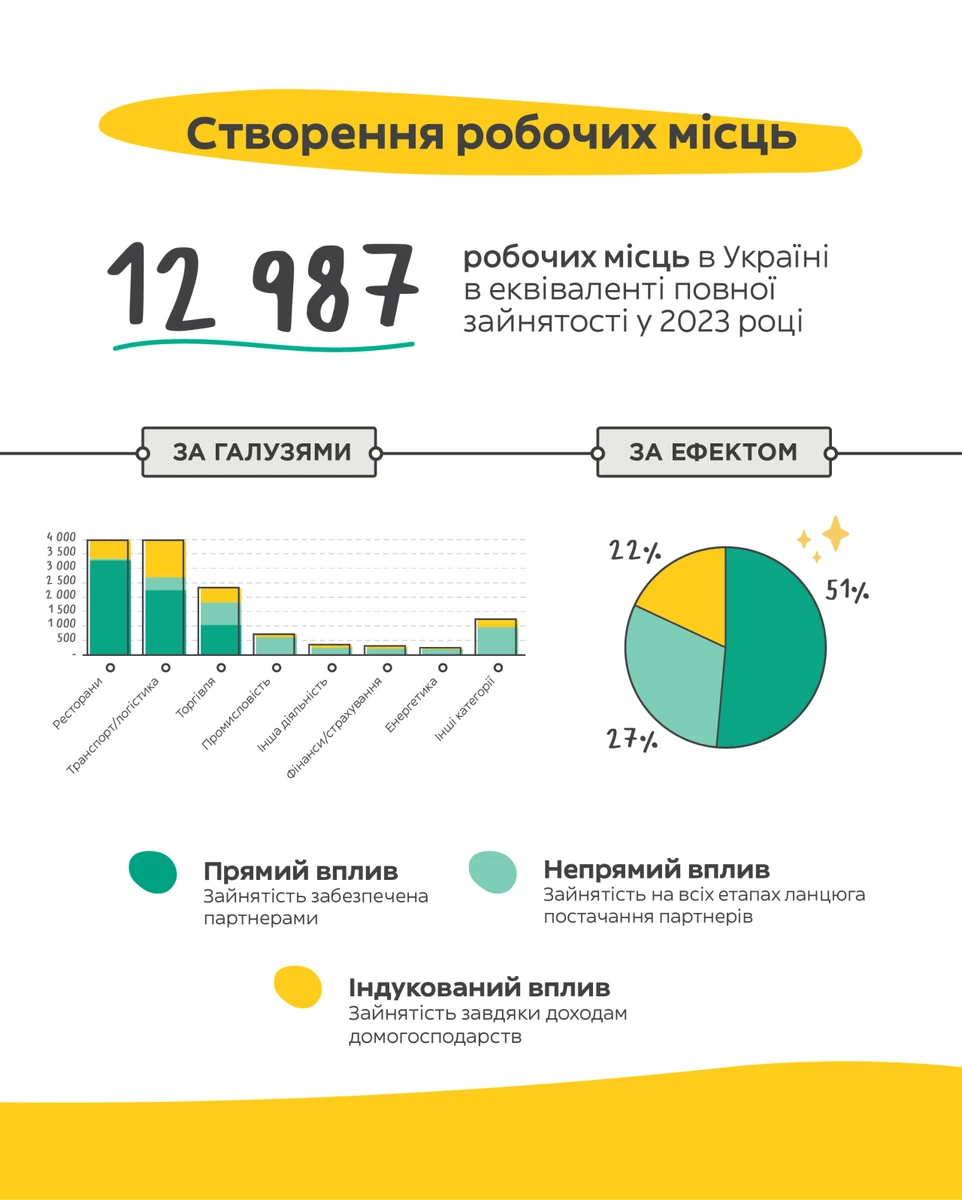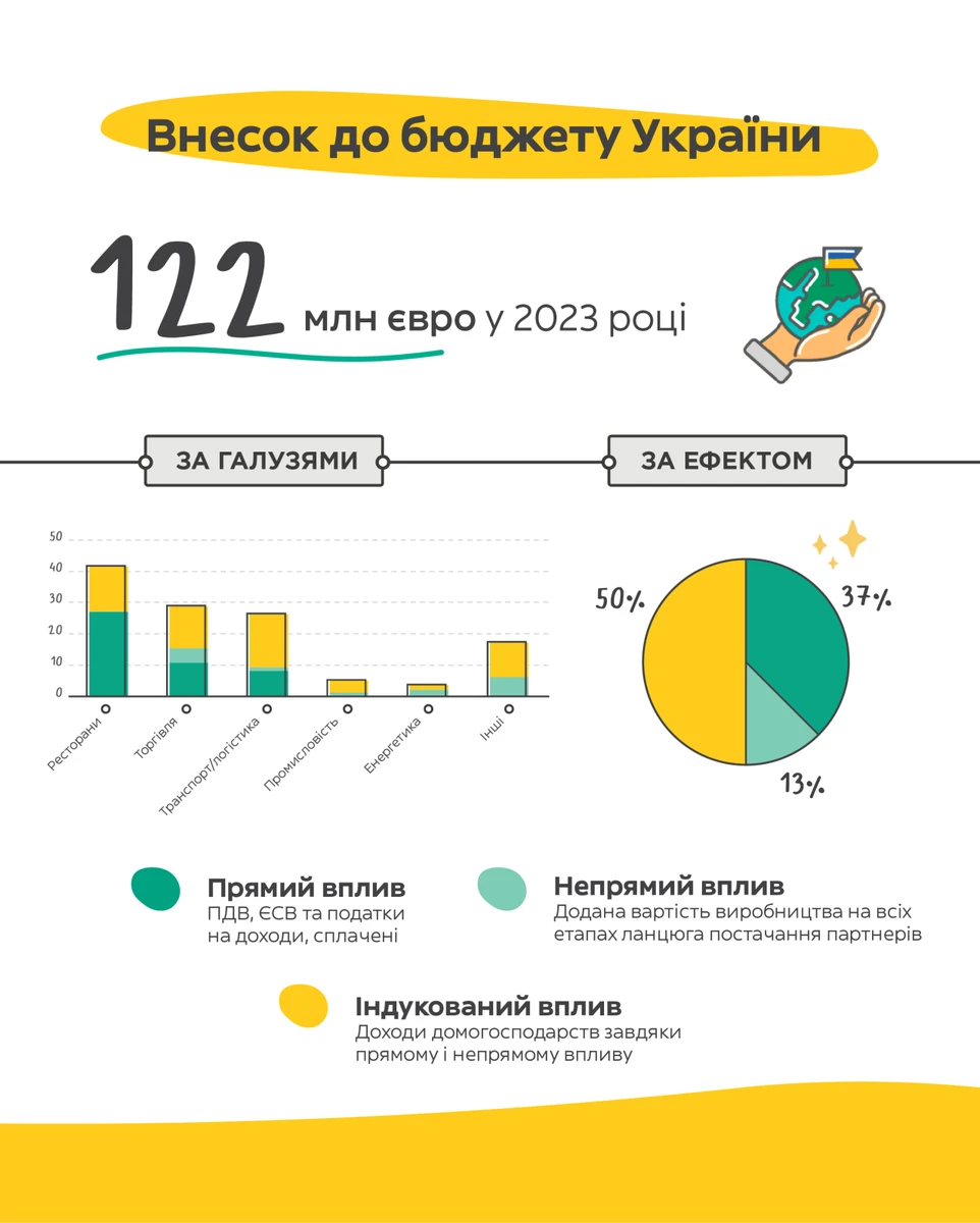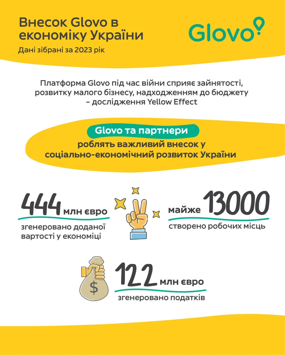 Дослідження Yellow Effect, проведене міжнародною компанією Statista, показало, що у 2023 році Glovo з партнерами забезпечили 12 987 робочих місць в еквіваленті повної зайнятості* та 122 млн євро платежів до держбюджету. Окремо Glovo очікує сплатити до кінця поточного року 495 млн грн податків, а загалом з початку повномасштабного вторгнення по вересень цього року компанія перерахувала до бюджету 889 млн грн. За 6 років роботи в Україні Glovo інвестувала понад 100 млн євро.