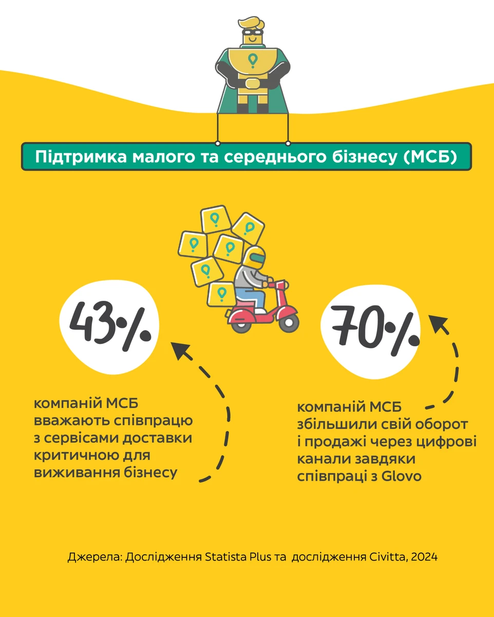 Завдяки своїм інноваціям та соціально відповідальній стратегії Glovo сприяє розвитку громад та малого і середнього бізнесу (МСБ). Відповідно до опитування Civitta, 67% партнерів Glovo з МСБ вважають співпрацю з Glovo критичною для їхнього успіху. Наразі сервіс швидкої доставки Glovo доступний у 38 містах України. Першим містом на сході України, у якому компанія запустила роботу з початку повномасштабного вторгнення, став Павлоград у вересні 2024 року.
