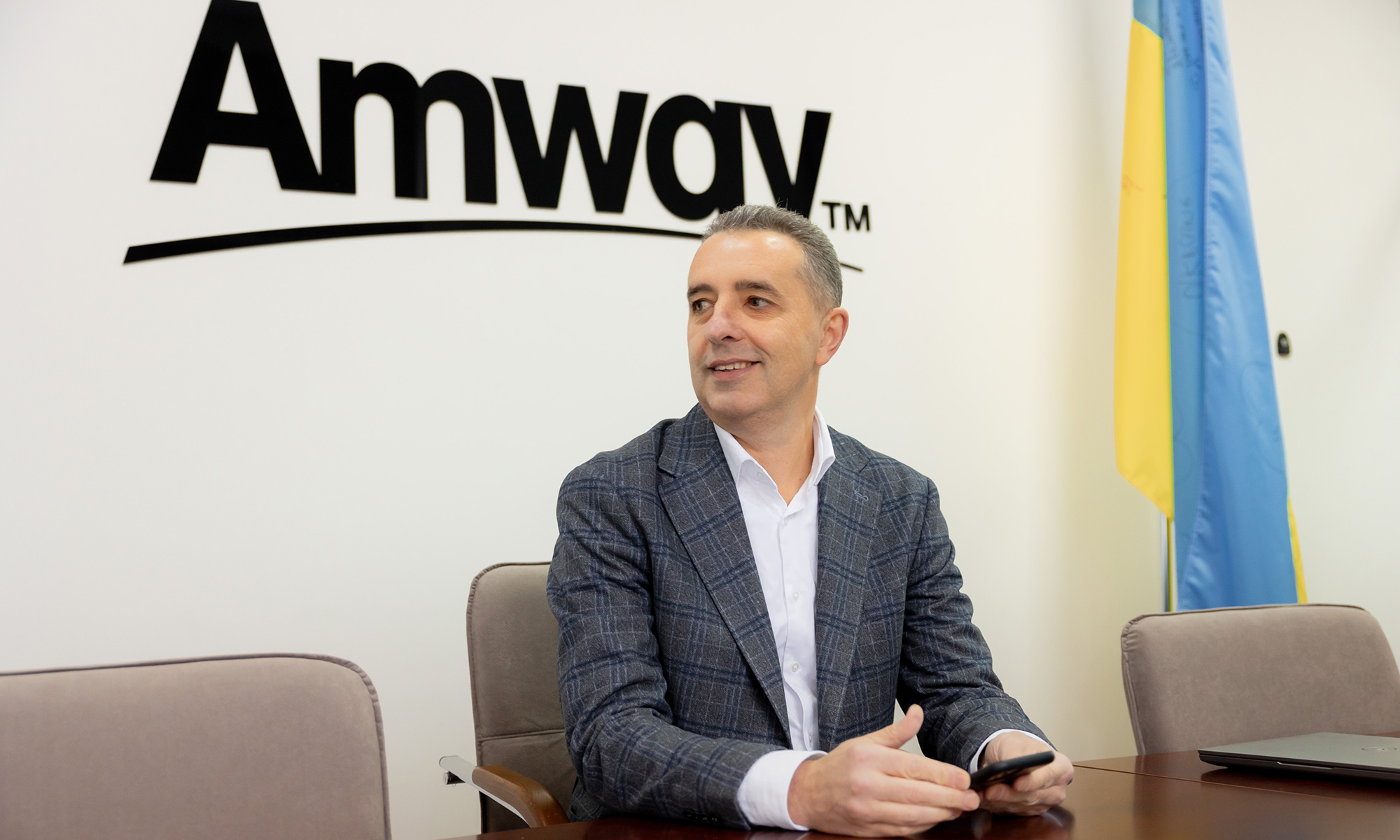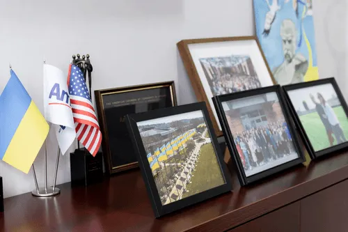 На столі генерального директора Amway Україна Дмитра Тютченка фото з величезною кількістю прапорів України. Його зроблено в штаті Мічиган, США, біля головного офісу компанії. Раніше там висіли прапори всіх країн, в яких представлена компанія, та з початком повномасштабного вторгнення головний офіс так висловив свою підтримку Україні.