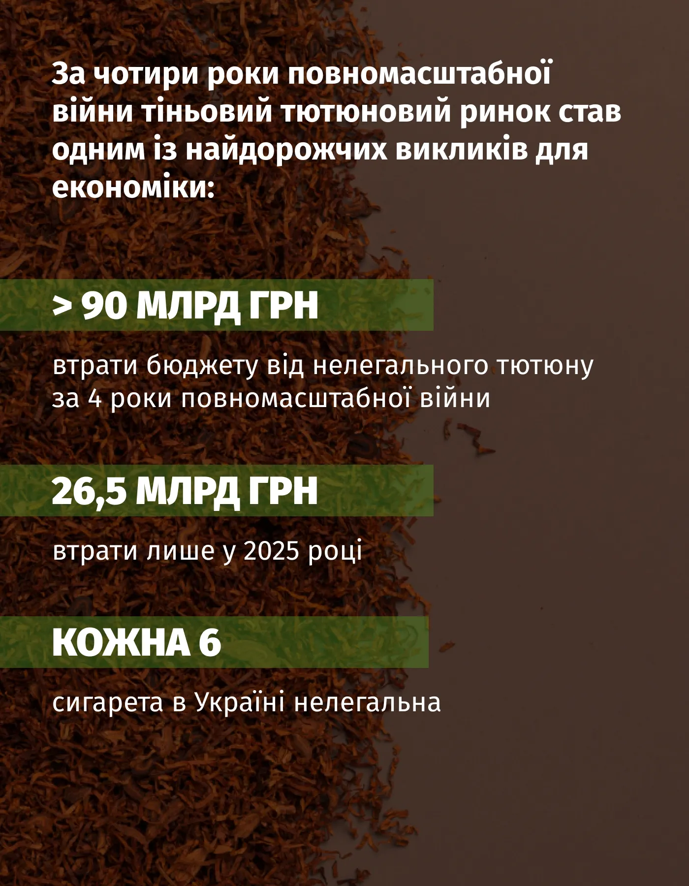 "Переважна більшість нелегальної тютюнової продукції виробляється на території України. При цьому, виходячи з даних Kantar Україна, можна обрахувати, що близько 2/3 всієї нелегальної тютюнової продукції у 2025 році походили від кількох українських виробників (згідно з інформацією, зазначеною на пачці), які мають чинні ліцензії, що вказує на системний характер проблеми та необхідність припинення діяльності таких напівлегальних виробників. Виявлення та ліквідація схем недобросовісних ліцензіатів, через які формується більшість тіньового ринку сигарет, має бути ключовою метою діяльності контролюючих та правоохоронних органів", – наголошує Наталія Фесюн, гендиректорка Асоціації "Укртютюн".