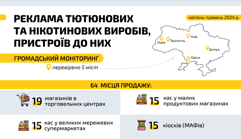 Зокрема, було встановлено, що в низці місць продажу друкована реклама тютюнових виробів розміщена на висоті до 1 метра – на рівні зросту дитини, реклама на дисплеях та моніторах, цінники, що затуляли медичні попередження про шкоду для здоровʼя. Також з метою стимулювання продажів тютюнових виробів, сигарет для нагрівання, електронних сигарет і рідин з нікотином, нікотинових снюсів у 84% випадків використовувався кольоровий фон або нерухома підсвітка. Були зафіксовані випадки реклами промоутерами.