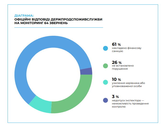 За результатами моніторингу до Держпродспоживслужби було скеровано 64 звернення. Згідно з офіційними відповідями, які отримали громадські активісти, у 61% випадків на продавців було накладено фінансові санкції, у 26% Держпродспоживслужба не встановила порушення, у 10% – керівник або уповноважена особа не були присутні під час перевірки, у 3% – інспектора Держпродспоживслужби не допустили до проведення контролю за дотриманням законодавства при продажу тютюнових виробів.