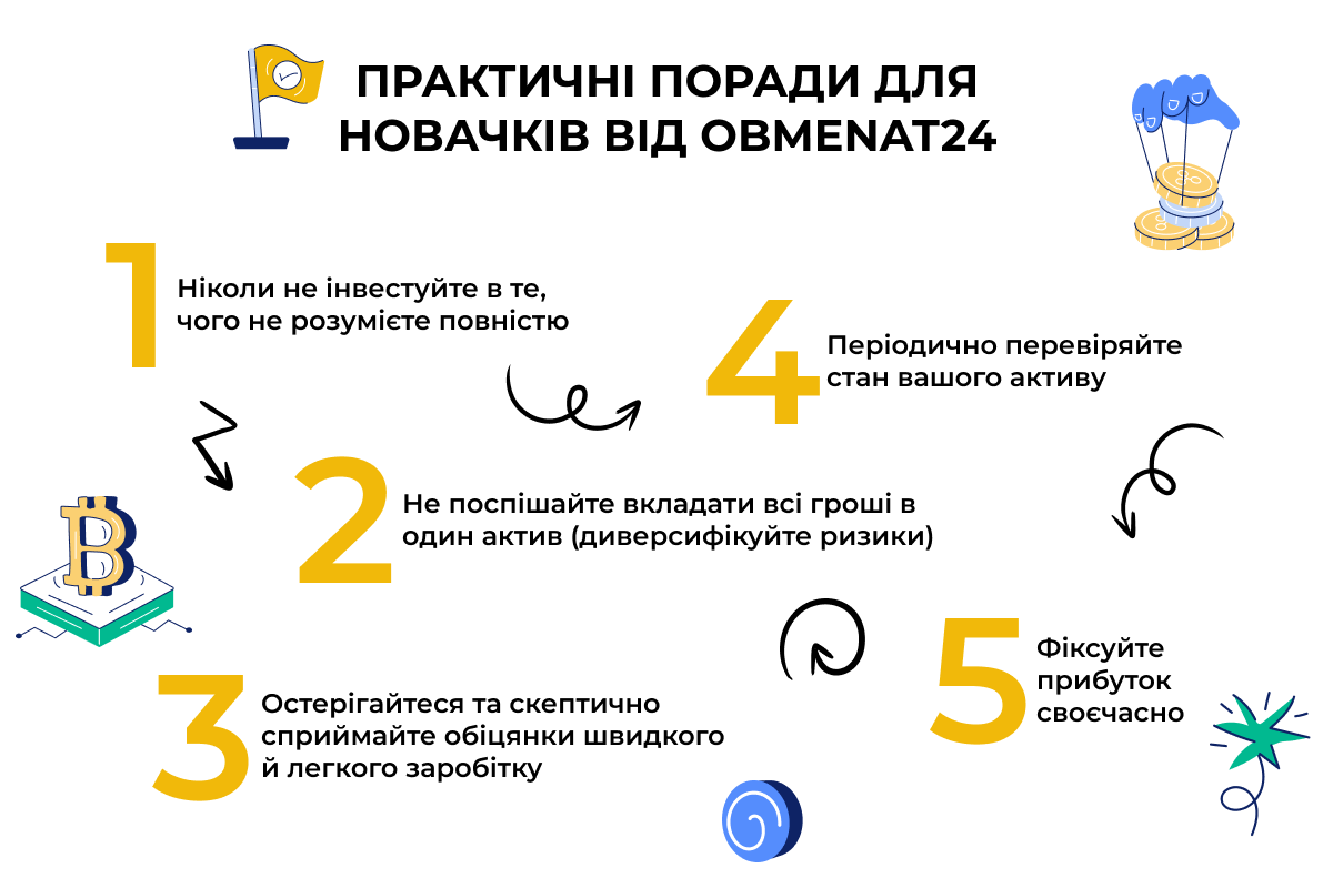 Не поспішайте вкладати всі гроші в один актив (диверсифікуйте ризики): краще розподіліть кошти між кількома проєктами/активами з різним рівнем ризику.