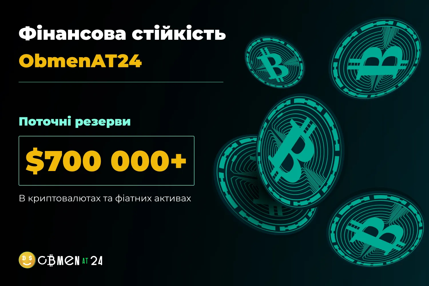 Поточні резерви ObmenAT24 диверсифіковані й перевищують суму еквівалентну $700 тис. в крипто- та фіатних активах. Це є запорукою високої ліквідності та операційної стійкості.