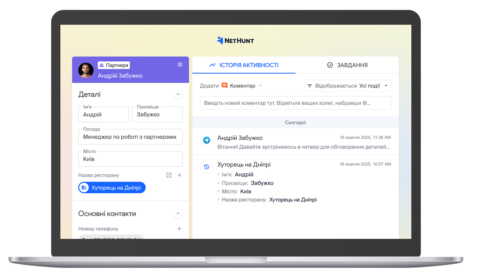 З інтеграцією NetHunt CRM з телеграмом ситуація змінилась. Усе листування з партнером автоматично фіксується в режимі реального часу. Менеджер бачить повний контекст розмов, керівник може швидко оцінити якість спілкування, а команда не губить нитку діалогу між етапами.