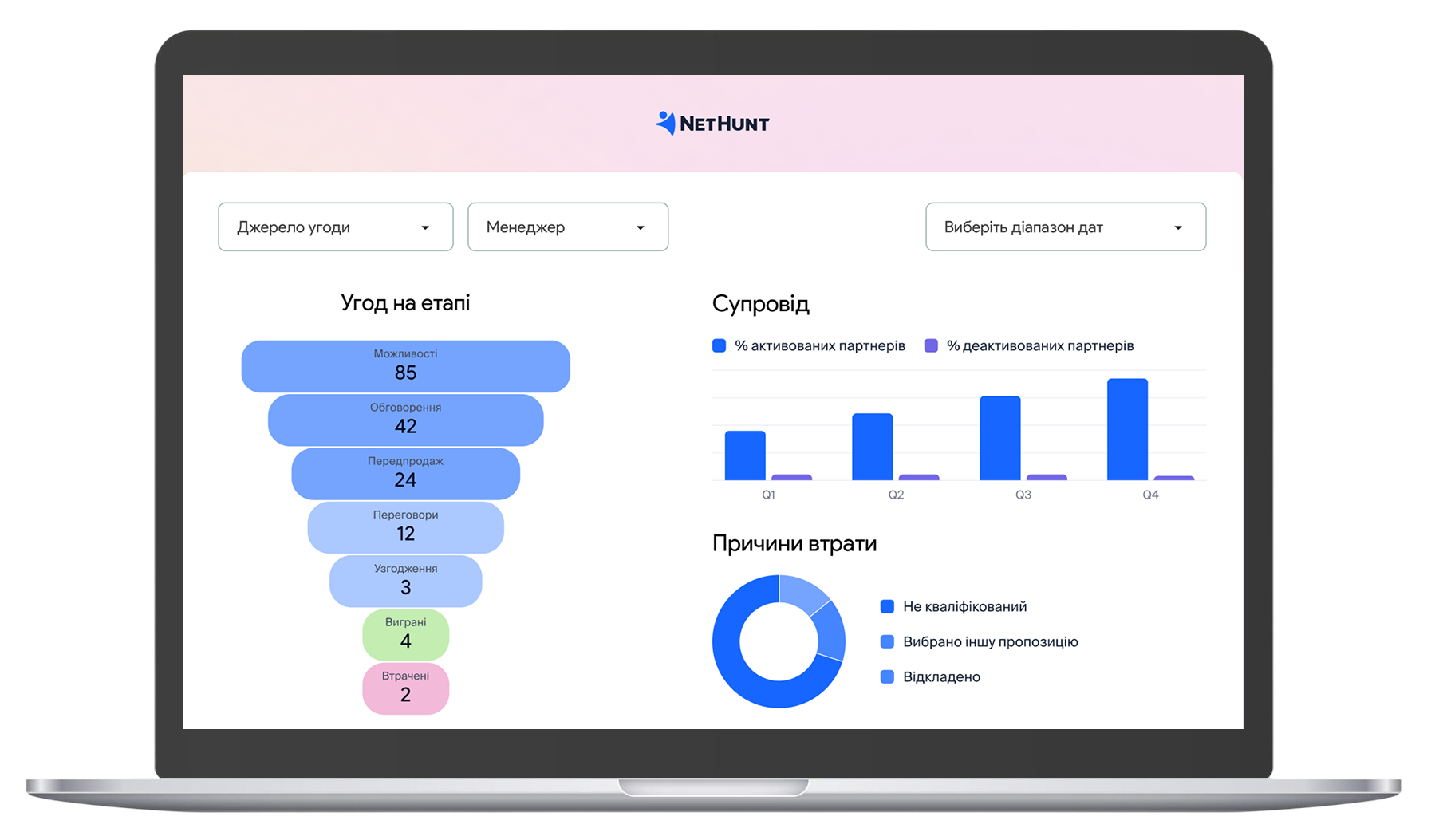 Тож CRM перетворюється з пасивної бази даних на проактивну систему контролю. Вона автоматично ініціює наступні кроки в процесі та сигналізує про необхідність виконання ключових дій, забезпечуючи стабільну швидкість процесу та мінімізуючи ризик людської помилки.