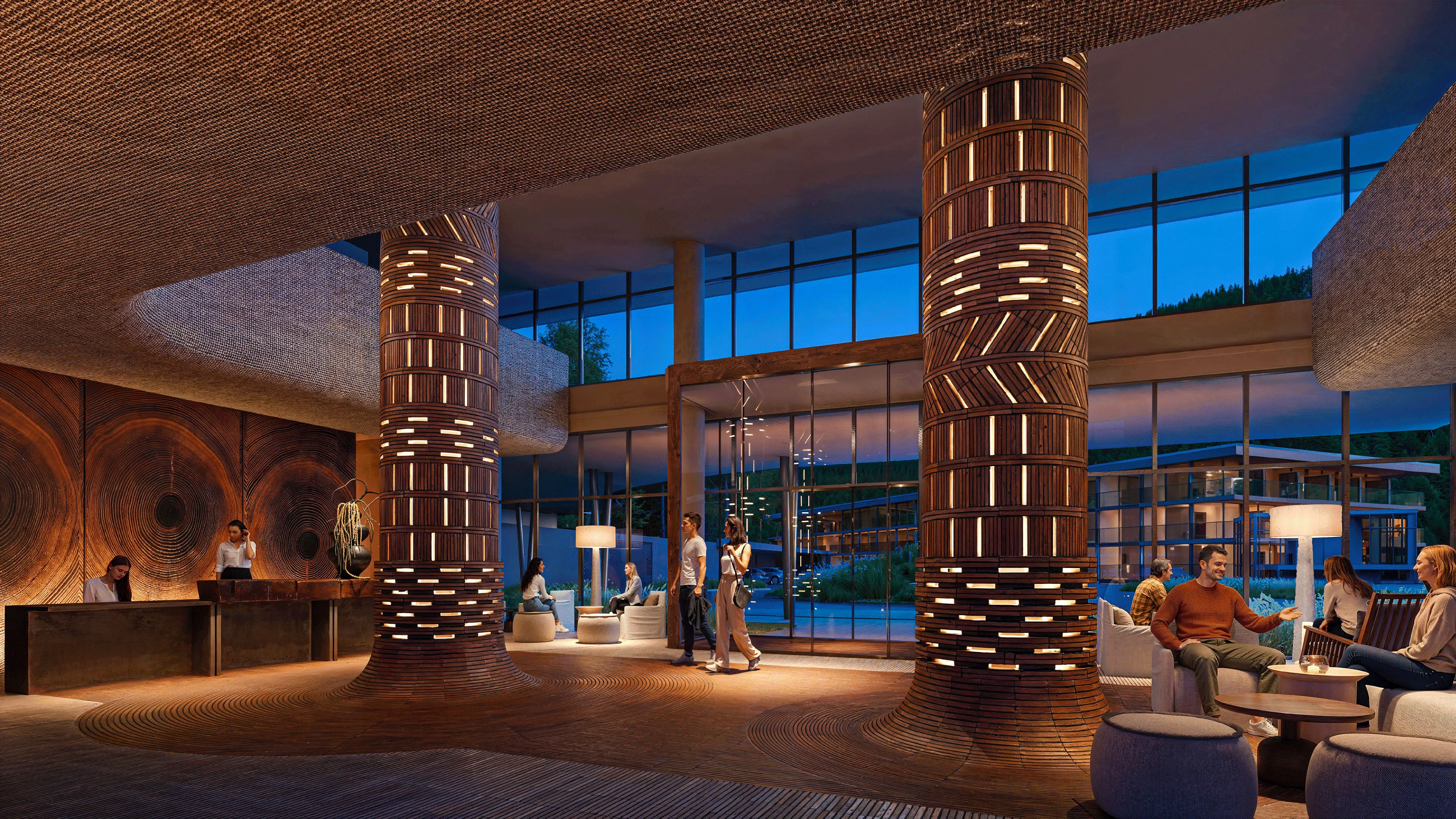 У лобі центральним елементом стане великий зріз дерева з річними кільцями, що символізує довготривалість та естетику поза часом. Це архітектура, розрахована на довгі роки, яка залишатиметься актуальною для багатьох поколінь.