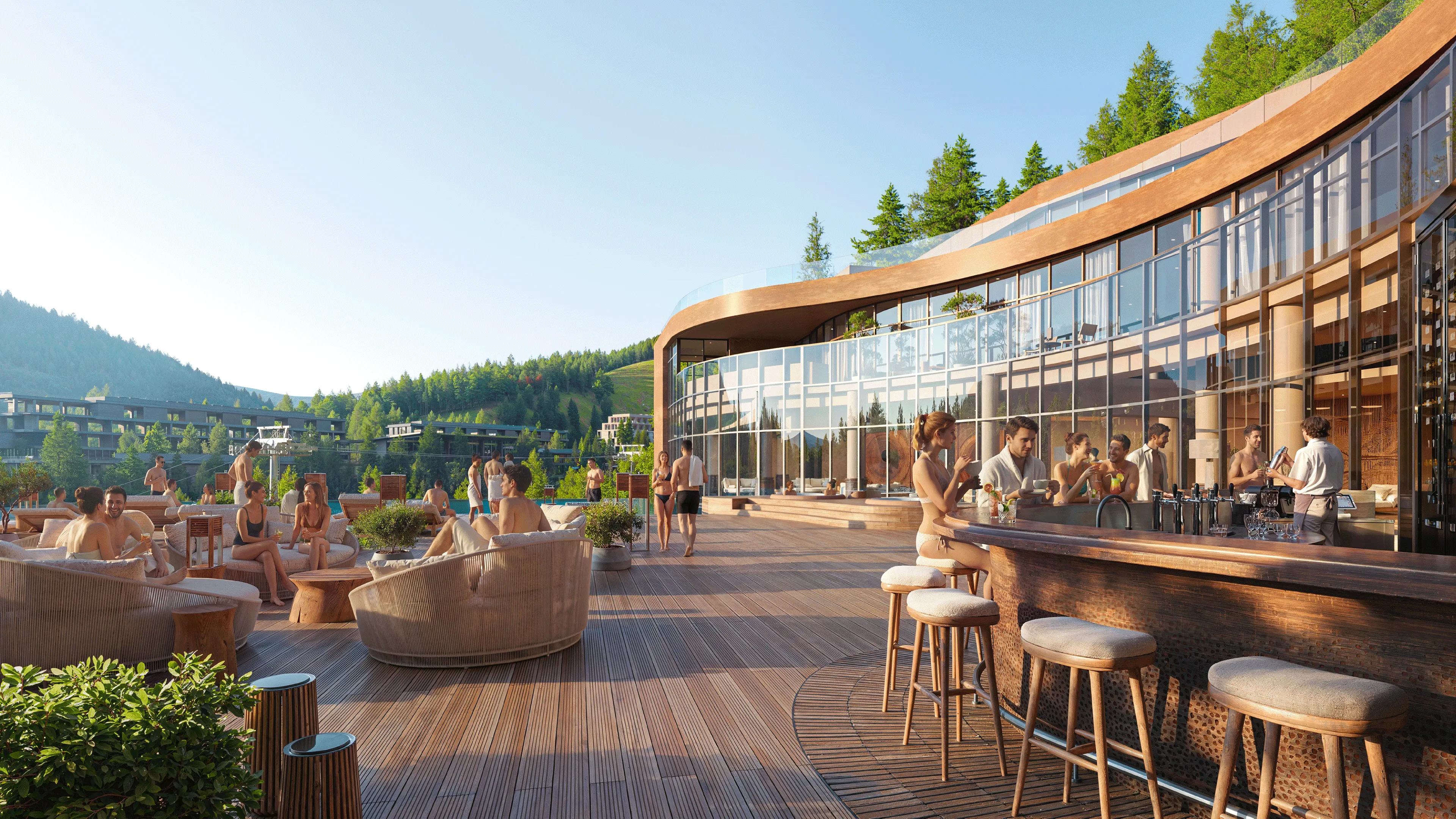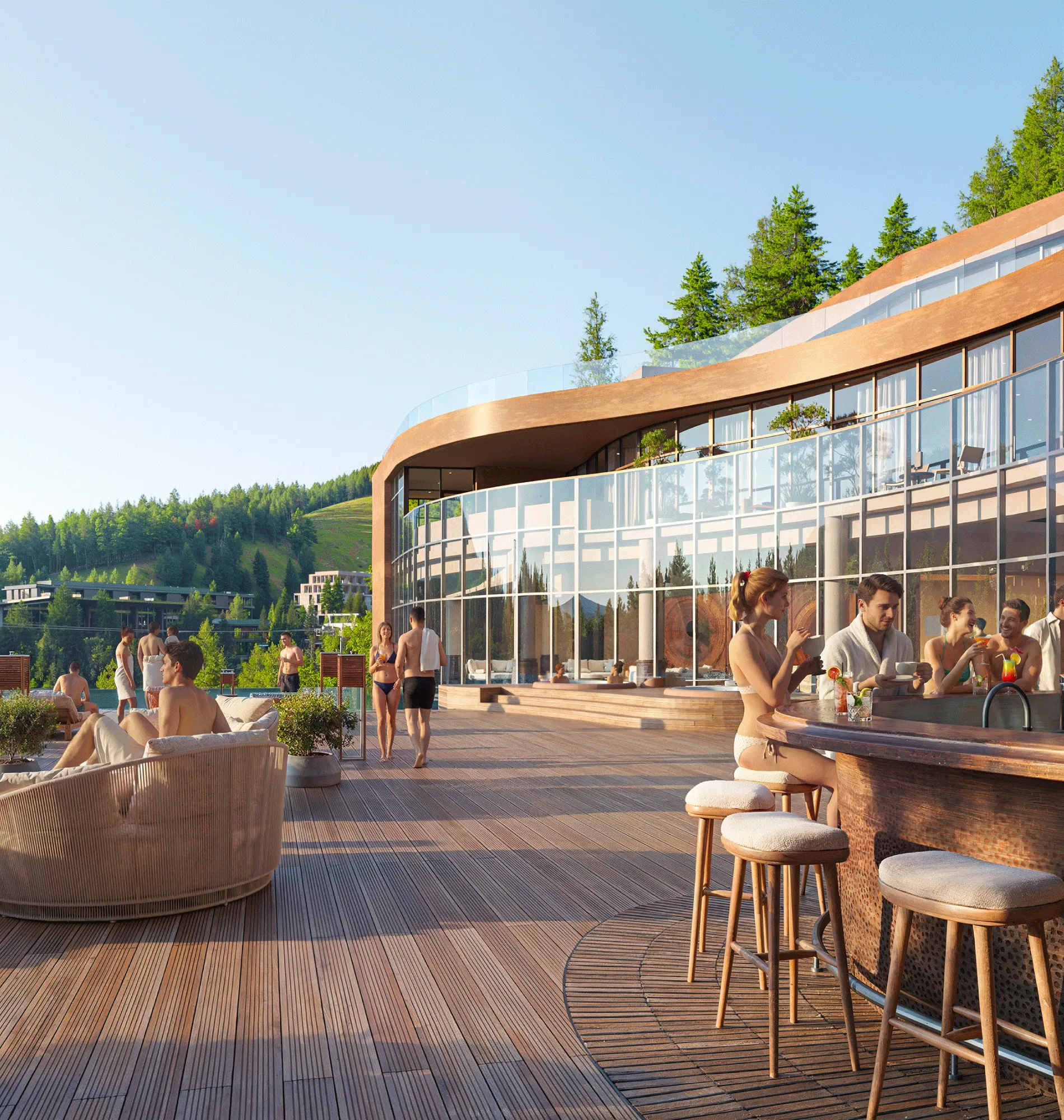 Однією з ключових особливостей готелю стане найдовший у високогір’ї Карпат видовий infinity-басейн довжиною 36,6 м, в якому водна гладь візуально зливається з гірським ландшафтом. Басейн починатиметься в будівлі готелю та продовжуватиметься надворі. Адаптивна система підігріву дозволить плавати просто неба за будь-якої погоди, вдихаючи аромат хвої та споглядаючи гірські вершини. Це буде простір для фізичного й ментального відновлення: від ранкових практик біля самої крайки води до повного занурення в атмосферу, де архітектура стає частиною навколишньої природи.
