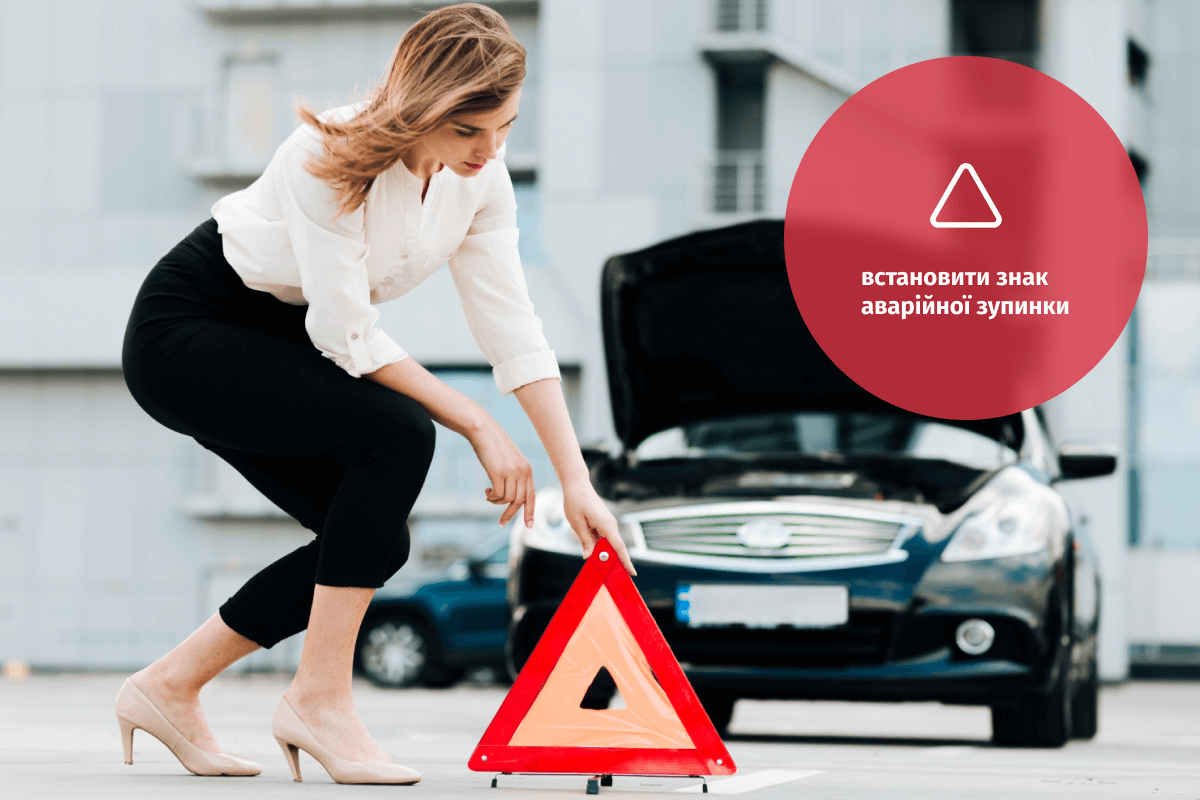 Найперше потрібно зупинити транспортний засіб та увімкнути аварійну сигналізацію. Далі потрібно переконатися у власній безпеці та безпеці пасажирів та встановити знак аварійної зупинки (який обов’язково має бути в кожному авто).