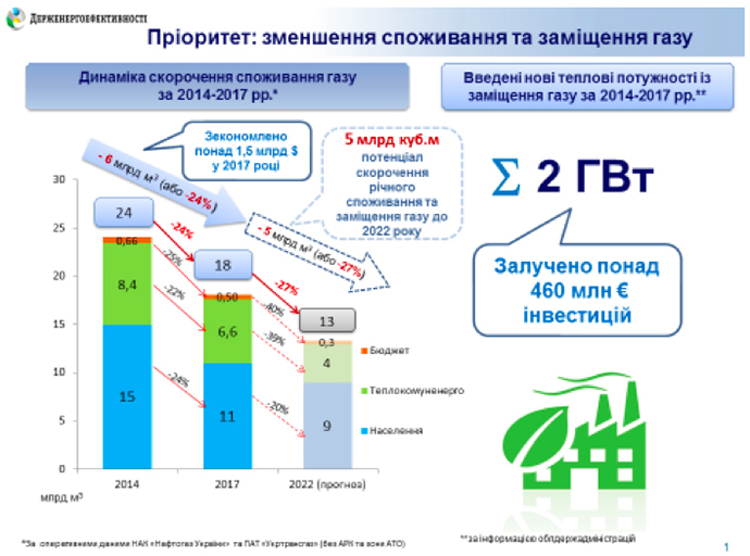 У 2017 році населення, бюджетна сфера та підприємства ТКЕ без врахування промисловості скоротили річне споживання газу на 6 млрд куб м порівняно з 2014 роком, в тому числі завдяки заміщенню газу біопаливом.