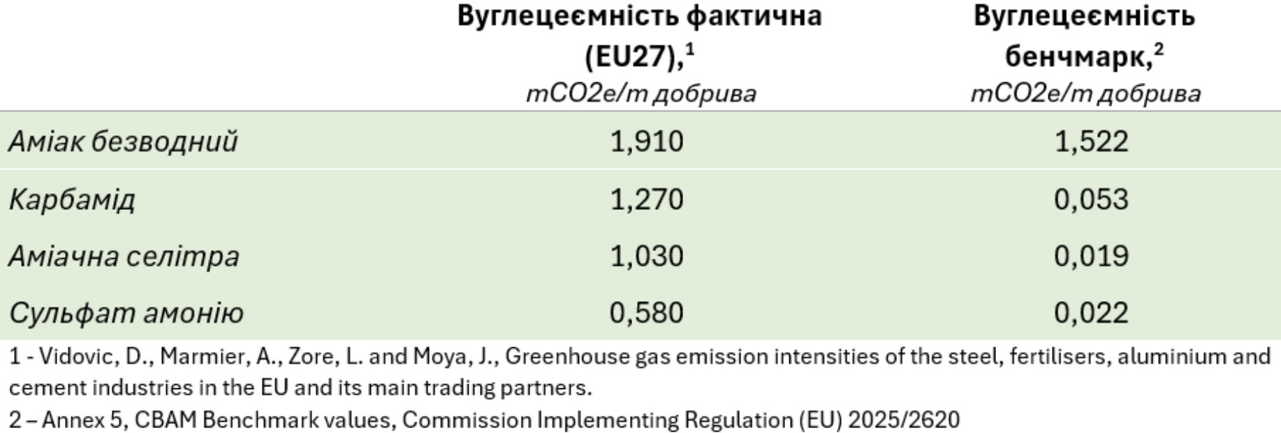 Сравнение фактической углеродоемкости аммиачных удобрений в ЕС с эталонными значениями, которые действуют с 1 января 2026 года