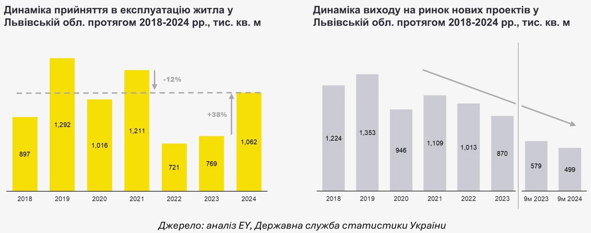 В 2024 году объем нового жилья, введенного в эксплуатацию во Львовской области, превысил 1 млн кв. м - на 38% больше, чем в 2023 году. Этот показатель все еще на 12% ниже объема 2021 года, но больше, чем в 2018-2020 годах.