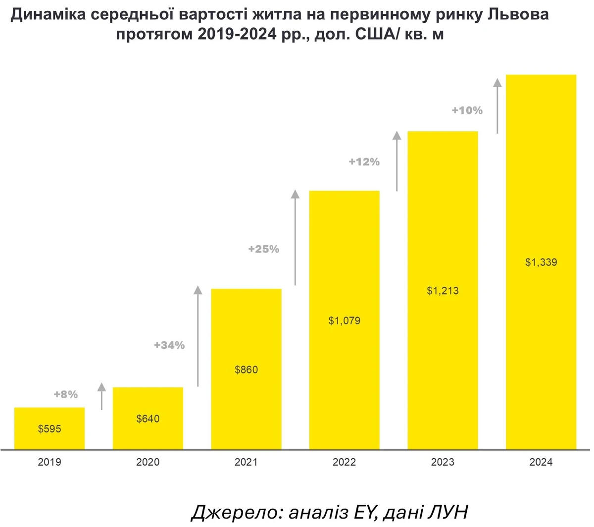 За три года стоимость квартир на первичном рынке Львова повысилась более чем на 40%. С 2019 года средняя стоимость квадратного метра в городе ежегодно увеличивалась на 18% и выросла с 595 долл. за кв. м до 1 339 долл. за кв. м.