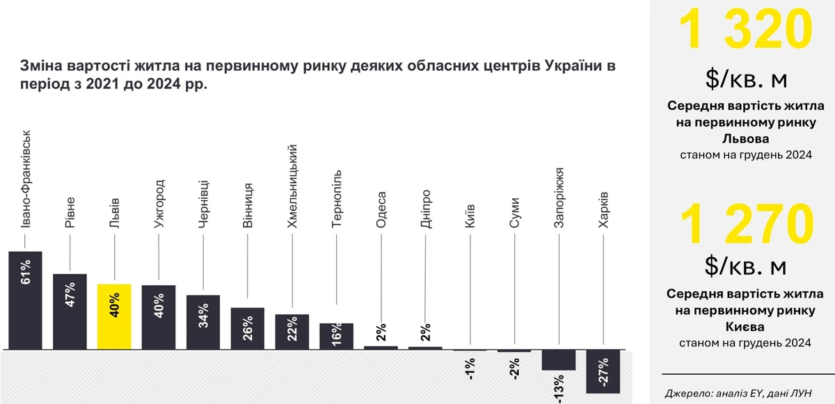 В конце 2024 года цены на квартиры в новостройках Львова достигли рекордных 1 320 долл. за кв. м, опережая столичные показатели. По сравнению с 2021 годом динамика средней стоимости жилья была одной из самых высоких среди всех областных центров.