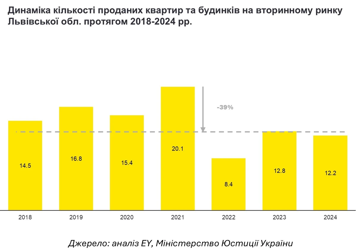 На вторичном рынке количество сделок по купле-продаже жилья во Львовской области в 2024 году составило около 12 тыс., что на 5% ниже аналогичного показателя 2023 года и на 39% ниже, чем в 2021 году. Незначительное снижение по сравнению с 2023 годом может объясняться кибератакой на реестры Минюста в декабре 2024 года, когда около месяца не работал реестр прав на недвижимое имущество.