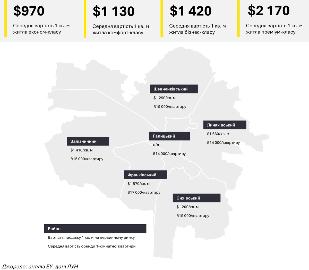 Во Львове самые высокие цены зафиксированы в центральной части города (Галицкий район), однако в феврале 2025 года новостроек в этом районе не было. Соответственно, самые высокие средние цены наблюдались в Лычаковском и Франковском районах (1 660 и 1 570 долл. за кв. м соответственно). Самые низкие средние цены были в Сиховском и Шевченковском районах города (1 200 и 1 290 долл. за кв. м соответственно).