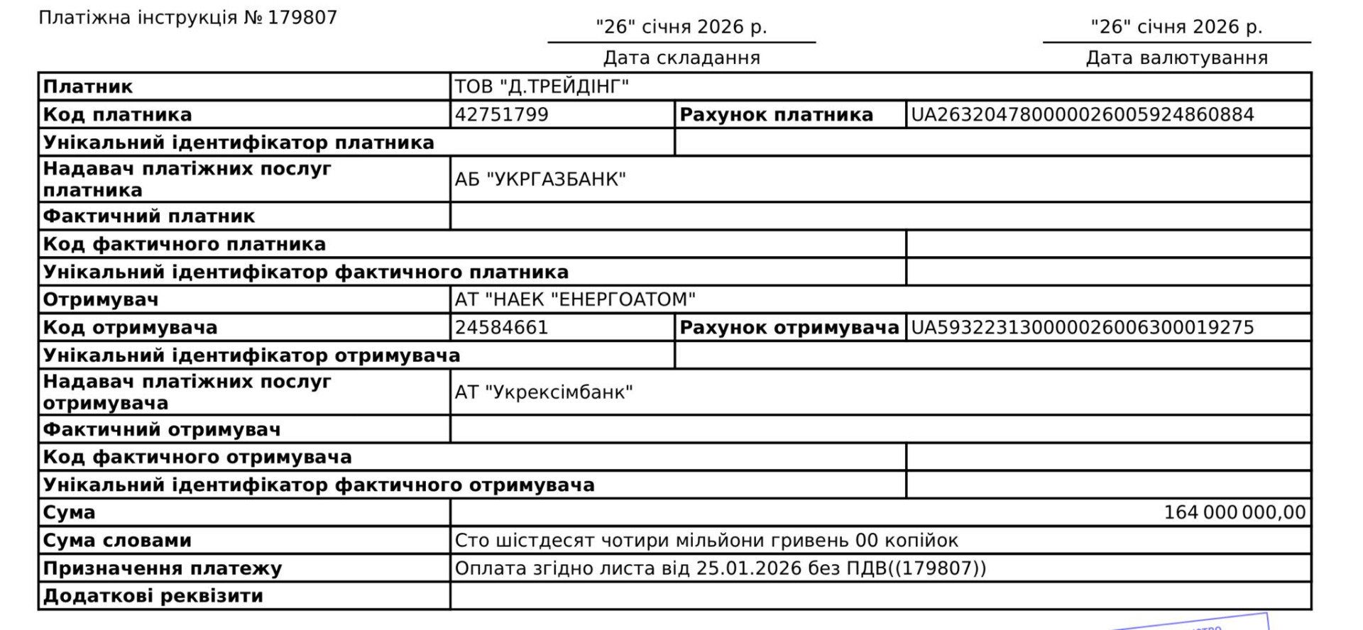 Речь идет о компенсации, связанной с волатильностью цен на рынке электрической энергии, 164 млн грн., что равно разнице между ценой РДН, которая сложилась на рынке в периоде поставки с 21.01.2026 по 25.01.2026 и цене дополнительного соглашения, пояснили в Д.Трейдинг.