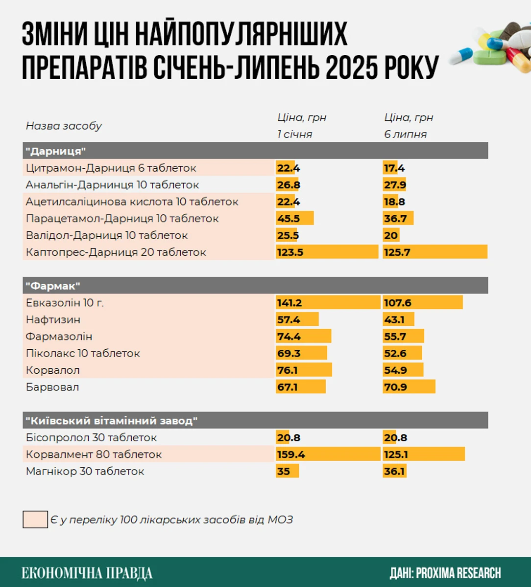 "Мониторинг онлайн-цен в пяти ведущих сетях аптек показал, что на некоторые препараты "Дарницы" наценка достигала 40-53%, а на отдельные - 60-76%. То есть некоторые сети, похоже, решили компенсировать свои недополученные прибыли по топ-100 повышенными ценами на препараты, которые не вошли в эту категорию", - говорит Загорий.