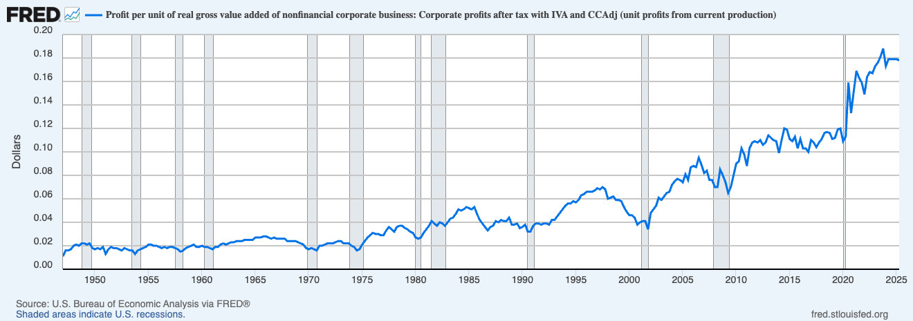 Возьмем для примера США. За последние десятилетия в США прибыль на единицу реальной добавленной стоимости росла, с заметным скачком в 2020-х.
