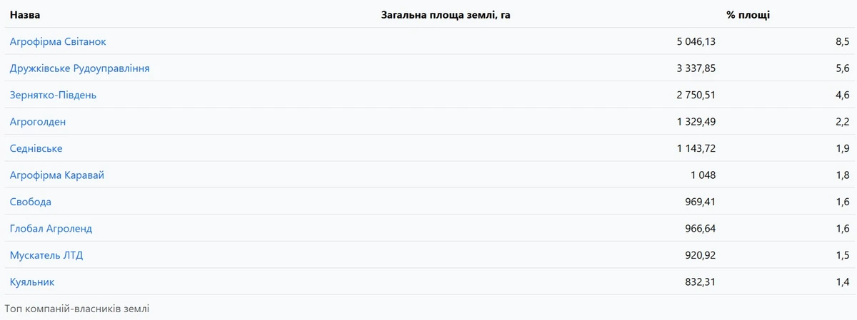 Почти третью часть украинской земли в собственности бизнеса владеют только 10 компаний. Совокупно эта десятка владеет 18 345 гектарами. Впрочем, даже в перечне лидеров большой разрыв: крупнейшая компания - землевладелец, агрофирма "Свитанок", имеет в 10 раз больше земель, чем компания "Куяльник", замыкающая десятку.
