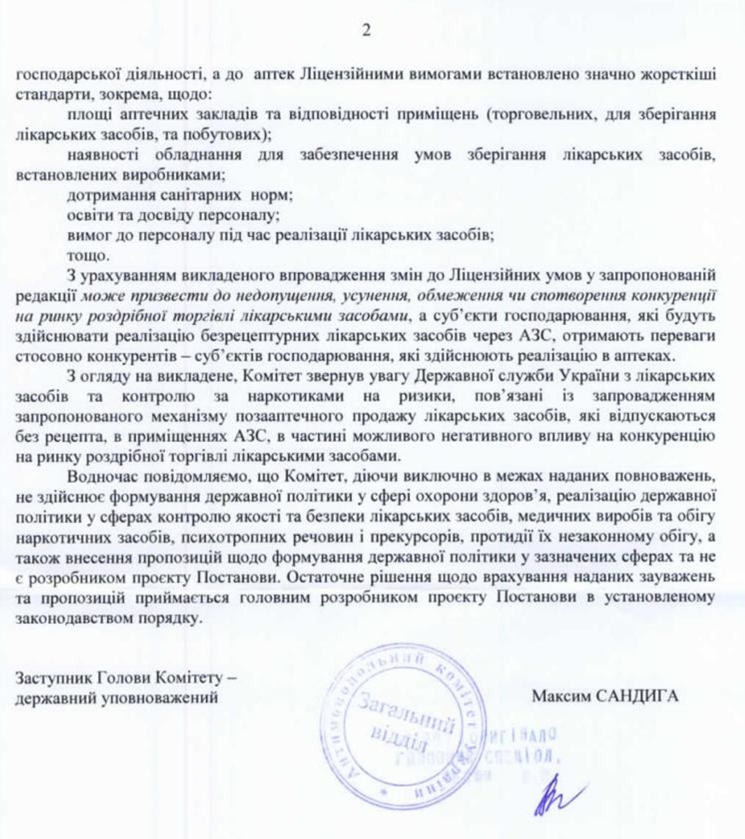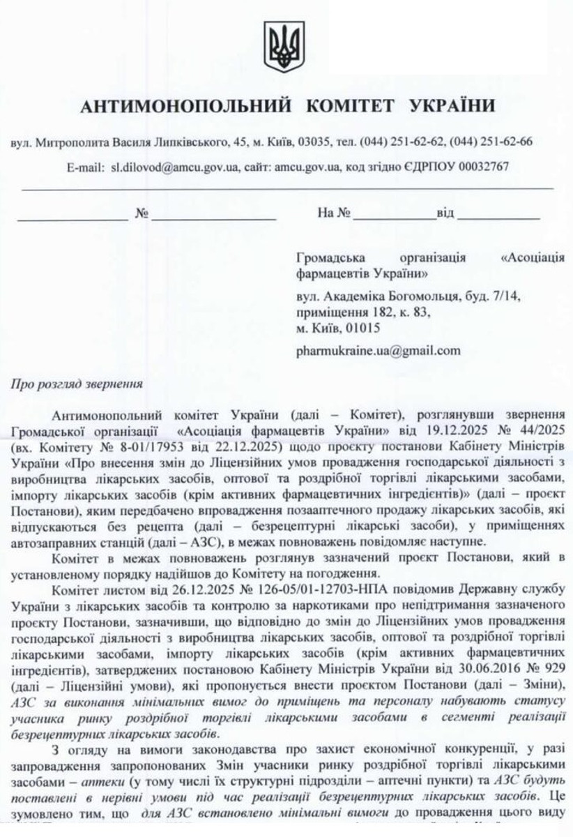 В ответе на обращение Ассоциации фармацевтов Украины, которая поддерживает позицию аптек относительно недопущения продажи лекарств на заправках, комитет сообщил, что не поддержал инициативу правительства. Там считают, что АЗС имеют преимущество над аптеками в сегменте продажи лекарств из-за упрощенных правил получения лицензии.