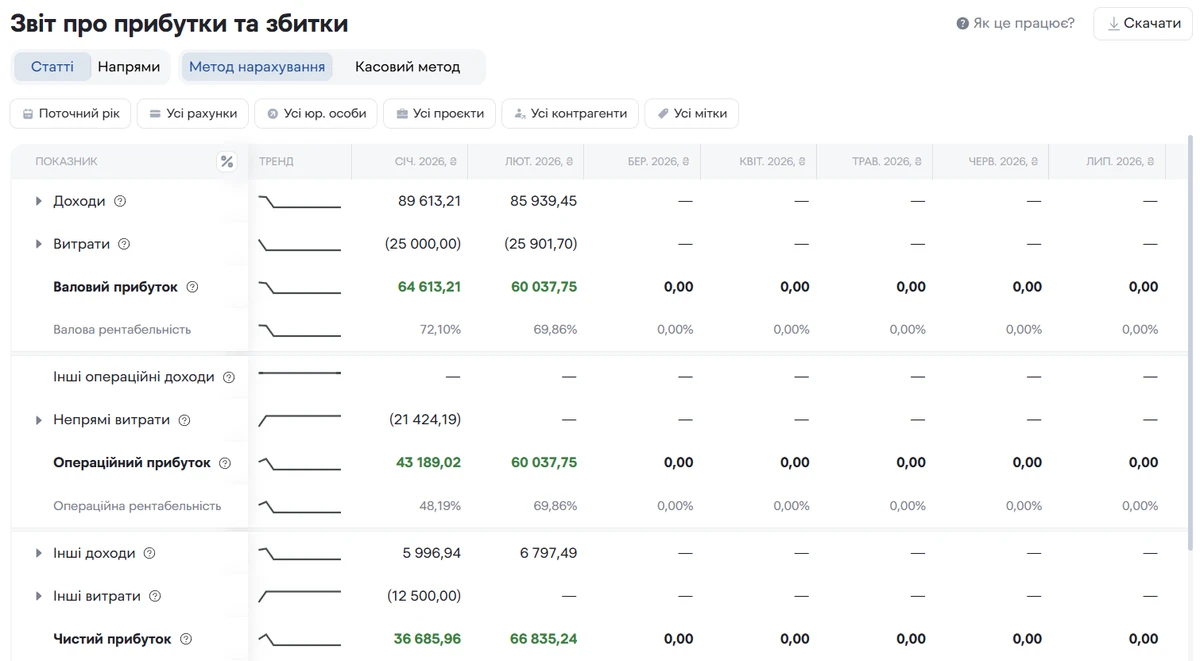 Вы подписали договор на выполнение услуг в марте - соответственно доход вы фиксируете в марте, даже если оплата зайдёт в апреле. То же самое с расходами. И это не какая-то бухгалтерская хитрость - это способ видеть бизнес-экономику. Без этого получается картина, где один месяц выглядит успешным из-за предоплаты, а следующий - провальным без всякой реальной причины. P&L раскладывает все по своим местам.