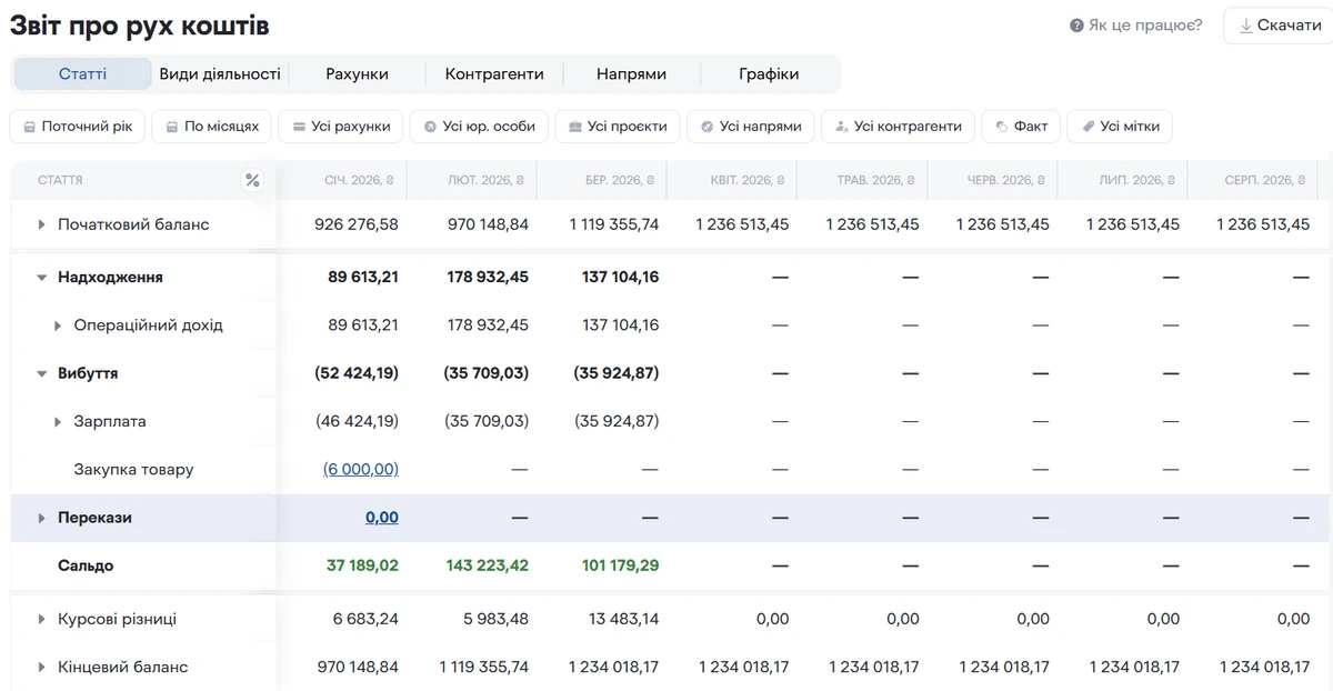Впрочем, есть важный нюанс. CashFlow фиксирует факт движения денег, но не объясняет их природу. Приведу пример: на ваш счёт поступило 300 тыс. грн, и может показаться, что это прибыль за месяц. Но на самом деле это предоплата от клиента за год работы, и если потратить эти деньги сейчас, то нужно понимать, что в следующие 11 месяцев от этого клиента не поступит ничего, а работу выполнять всё равно придётся.