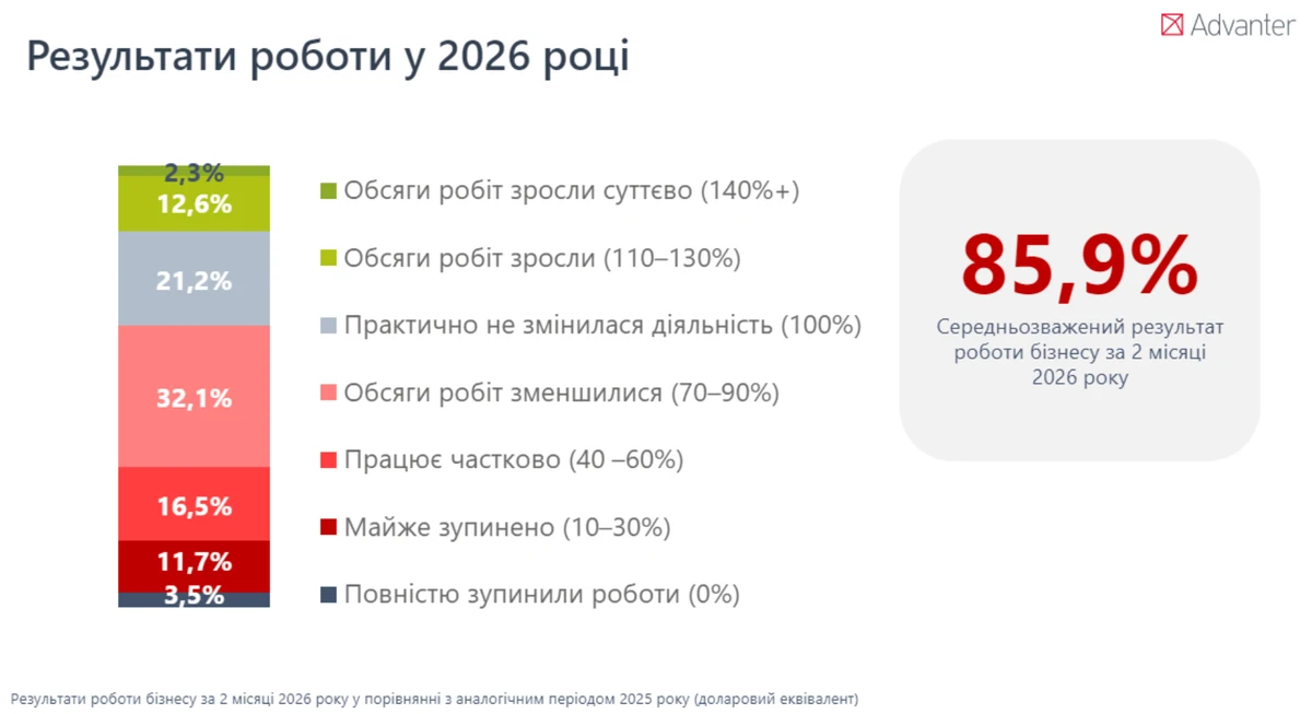 Средневзвешенный показатель работы бизнеса за первые два месяца 2026 года составляет лишь 85,9% от уровня 2025 года. Казалось бы, падение оборотов на 14% не фатально для страны в состоянии войны, если бы не скрытая за этим динамика.