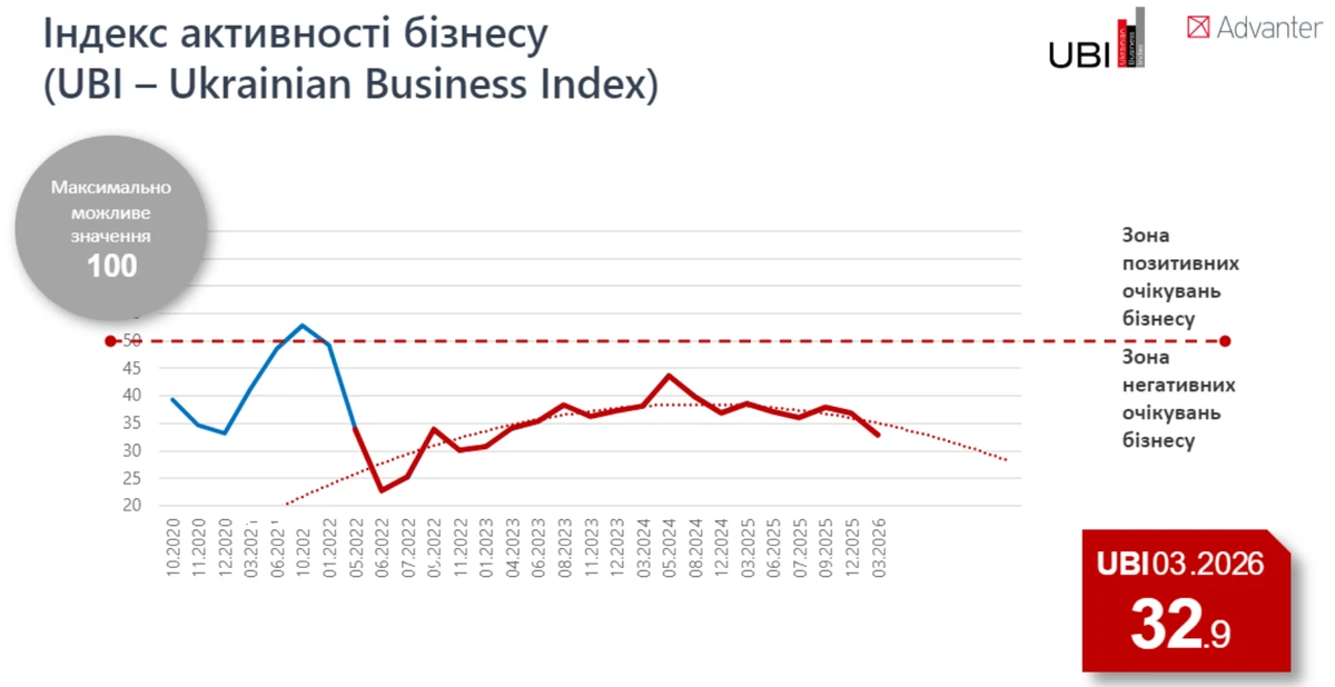 Главным барометром самочувствия частного сектора является индекс активности бизнеса (UBI). В марте 2026 года он упал до 32,9 балла из ста возможных. Показатель ниже 50 свидетельствует о негативных ожиданиях, а падение с отметки 36,8 в конце 2025 года означает, что бизнес заходит в зону системного сокращения активности.