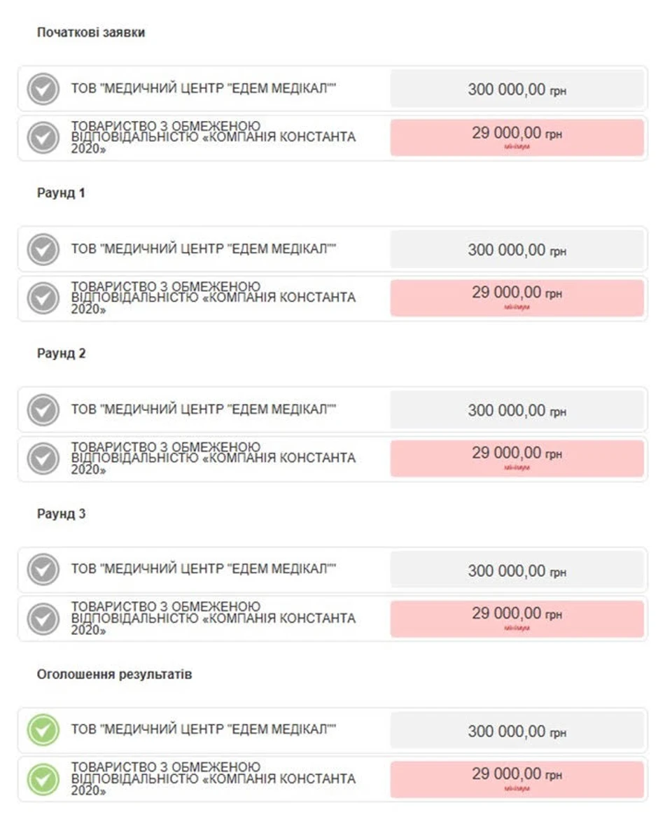 ООО "Медицинский центр "Эдем Медикал", которое подало тендерные предложения вторым и в связи с этим ходило первым, три раунда ставило 300 тыс. грн (30% вознаграждения управляющего), а ООО "Компания Константа 2020", которое подало тендерные предложения первым и в связи с этим ходило вторым, три раунда ставило 29 тыс. грн (2,9% вознаграждения управляющего).