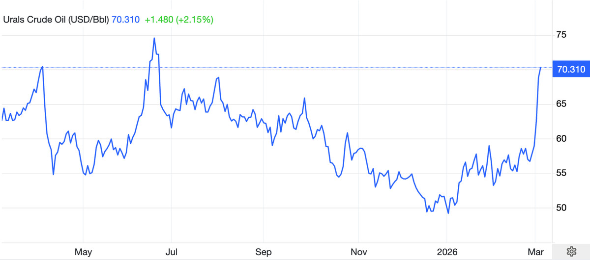 Цены на российскую нефть Urals поднялись выше 70 долларов за баррель впервые с 2025 года на фоне обострения войн на Ближнем Востоке и перекрытии Ормузского пролива.